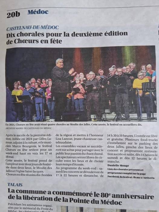 Avec 9 Chorales qui seront de la fête et qui nous accompagneront afin de vous faire passer un week-end en chansons et Lisa Lanoue, jeune chanteuse Castelnaudaise qui interprétera différentes chansons.