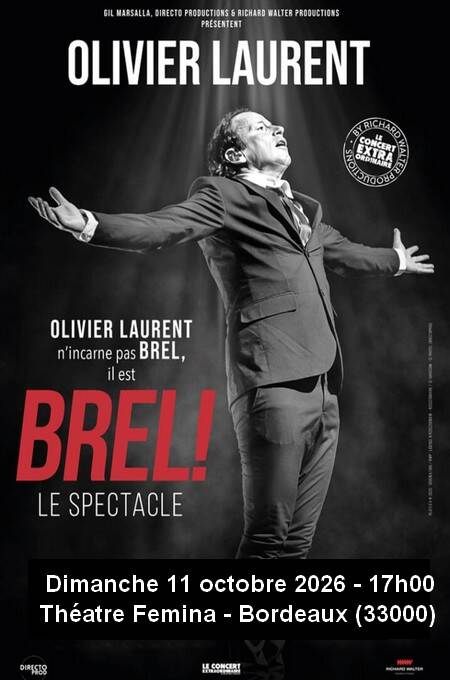 Accompagné par quatre musiciens d’exception, il vous emporte dans un tourbillon d’émotions, de la fougue de La Valse À Mille Temps à la profondeur déchirante de Voir Un Ami Pleurer. Déjà joué devant des milliers de spectateurs émus aux larmes à Paris, Montréal, New-York ou Dubaï, ce spectacle est un hymne à l’humanité, à l’amour et à la poésie. Un moment rare, à vivre et à chérir pour toujours. Olivier Laurent n’imite pas Brel, il lui redonne vie sur scène. « Un spectacle qui vous transportera hors du temps… » — Le Parisien (France)