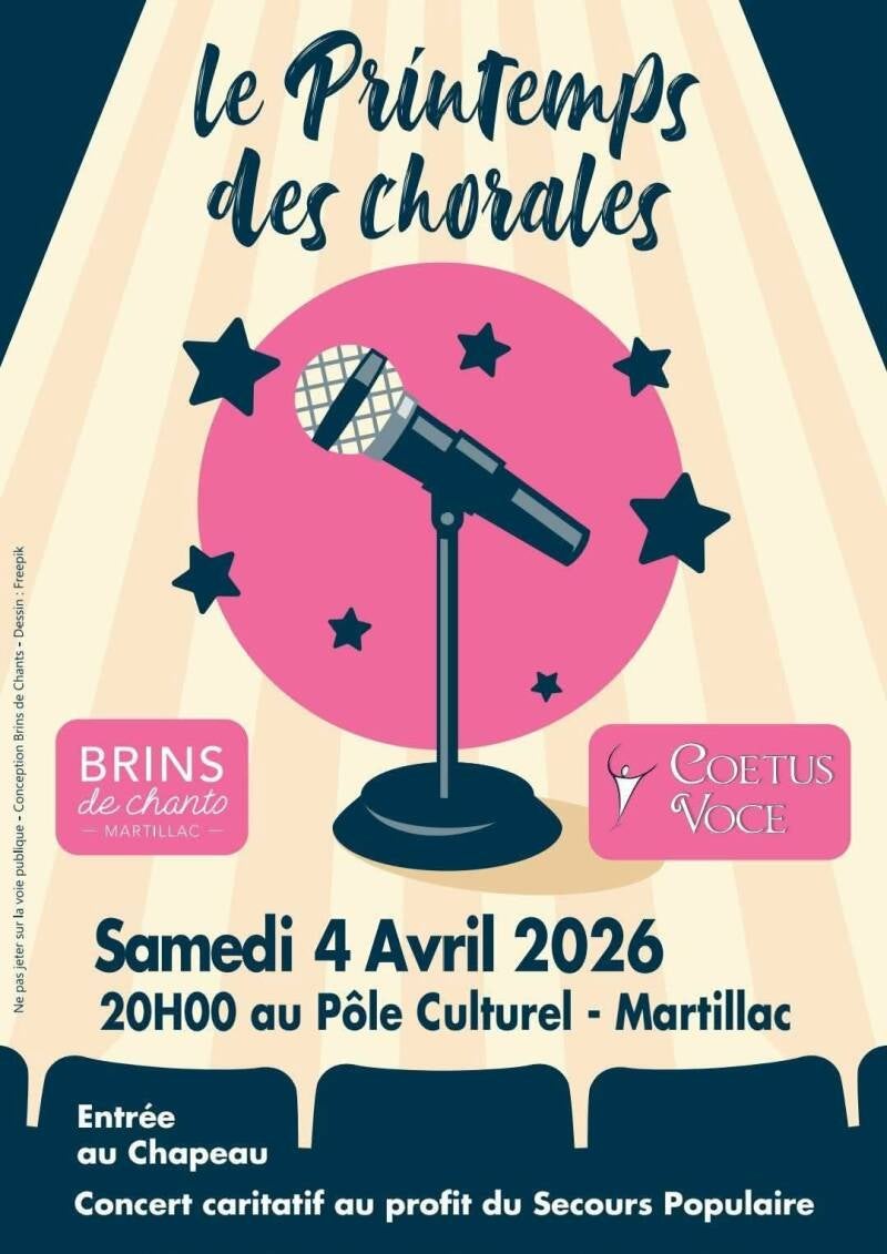 đ· Le Printemps des Chorales đŒ le Samedi 04 Avril 2026 - 20h00 au Pôle Culturel - MARTILLAC (33650), vous invite à un spectacle en chansons en compagnie des Chorales "Brins de chants" et du "Coetus-Voce" sous la direction du généreux Chef de Choeur Arnauld MARTIN. Venez assister à ce divertissement tout en chansons au profit de l'association "Secours Populaire"