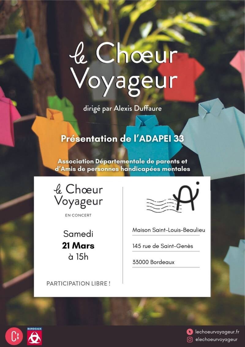 Nous voilà de retour en terre bordelaise après notre tournée ! Ce concert Samedi 21 Mars 2026 à 15h00 - Maison Saint-Louis-Beaulieu - 33000 Bordeaux, nous permettra de mettre en lumière l’association Adapei 33. Au plaisir de vous retrouver là-bas !