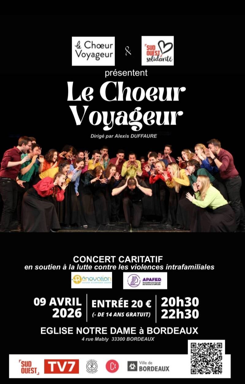 Nous vous retrouvons pour un concert caritatif en soutien à la lutte contre les violences intrafamiliales qui aura lieu le Jeudi 09 Avril 2026 - 20h30-22h30 à l’Eglise Notre-Dame d'Aquitaine 33000 Bordeaux. Au plaisir de vous y retrouver!